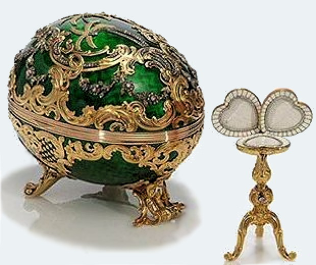 This egg is covered in a deep green enamel. The surface is then decorated with gold rococo cartouches, platinum flowers set with diamonds, and varicolored gold palms, also encrusted with diamonds.